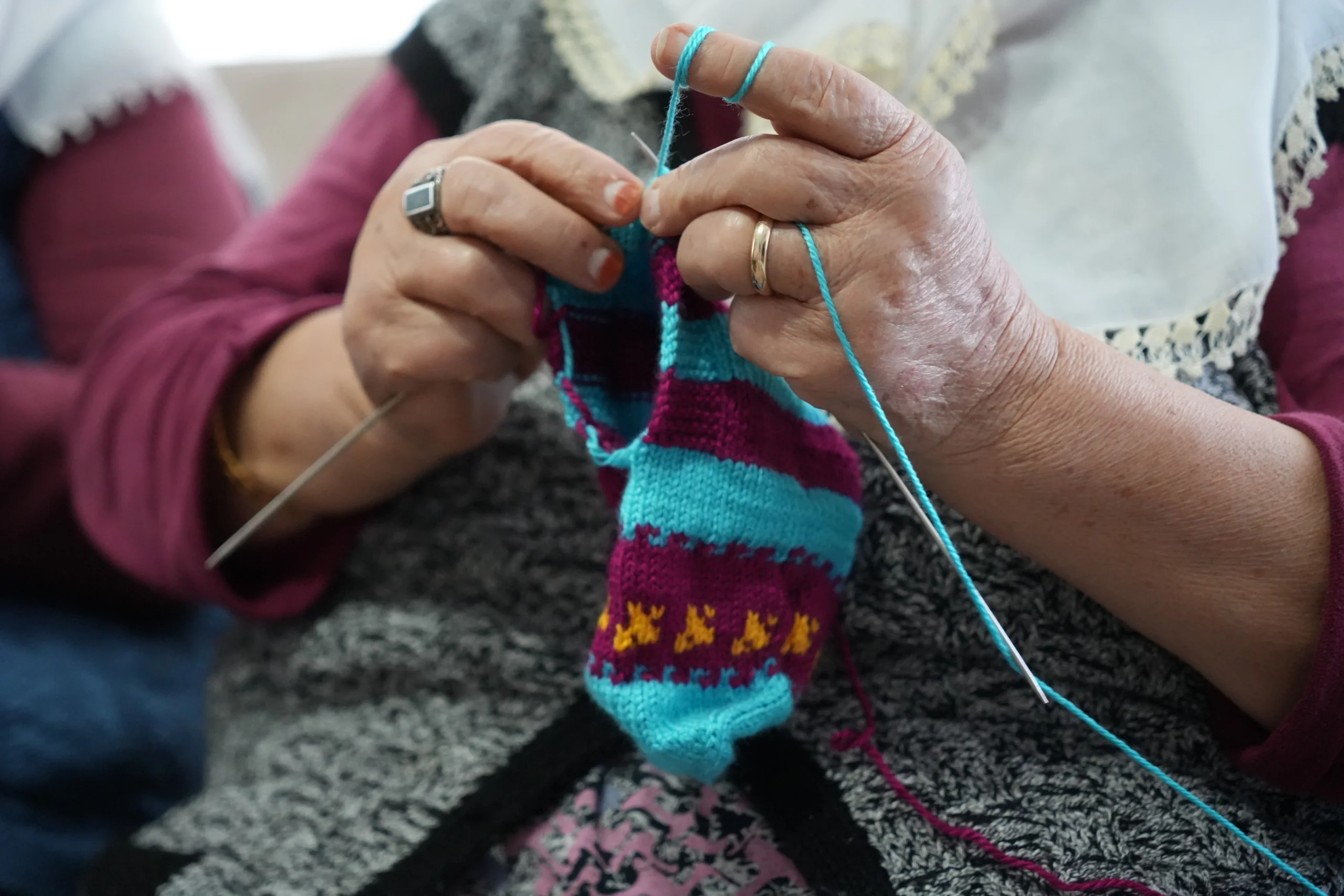 İsmail Ak’ın 80 yaşındaki kayınvalidesi Hayriye Aldırmaz, ilerleyen yaşına ve hastalıklarına rağmen ihtiyaç sahipleri için örgü örüyor. Yürüyemeyen ancak elinden şişi de eksik olmayan Aldırmaz, “10 senedir ihtiyaç sahiplerine örgü örüyorum. Hiç boş durmuyorum. Gelinim ve kızımla örüyorum. İpim olduğu zaman gece bile örüyorum” dedi.