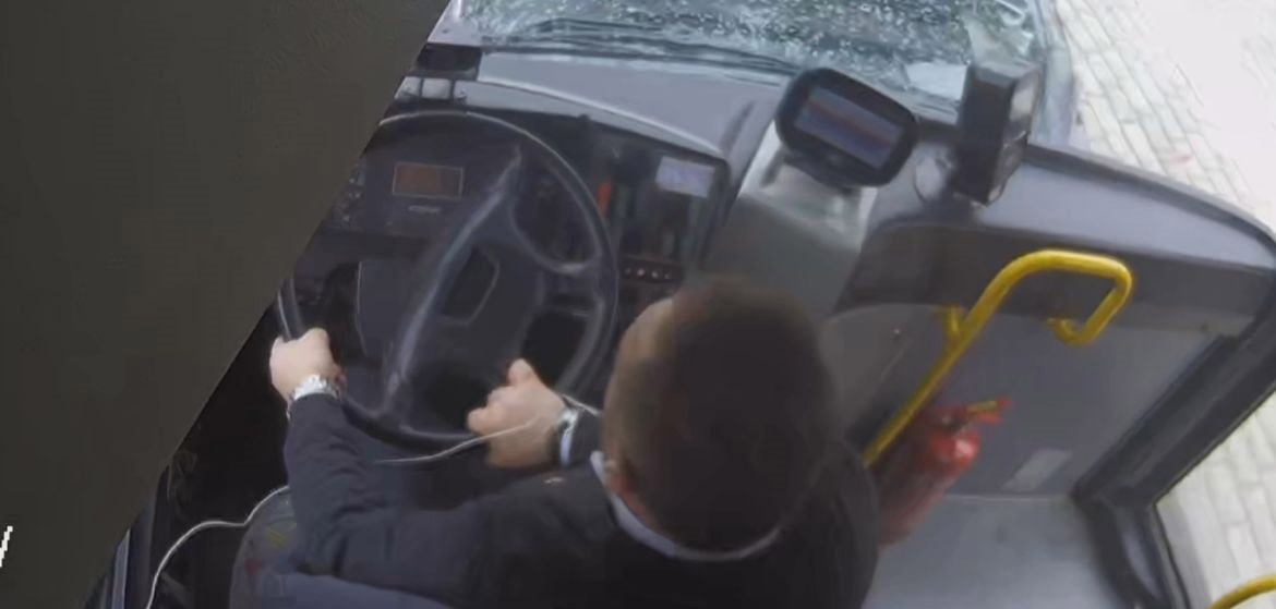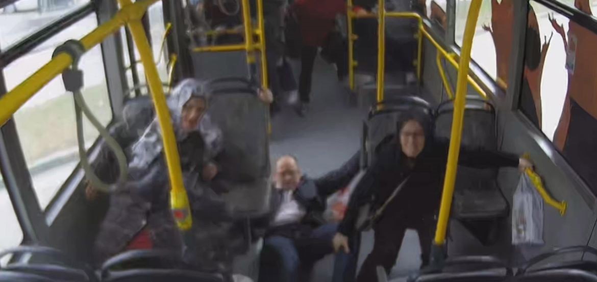 Araç içi ve dışındaki kameraya yansıyan görüntülerde frenlerden ses geldiği, şoförün önce park halindeki bir otomobile sonra da direğe çarptığı görülüyor. Çarpmanın etkisiyle otobüs içindeki yolcular çığlık çığlığa sağa sola savrulup başlarını çarptılar. Büyük bir faciayı önleyen ve kendisi de yaralanan şoförün ilk sorusu ise “iyi misiniz” oldu.