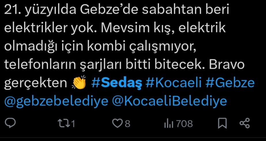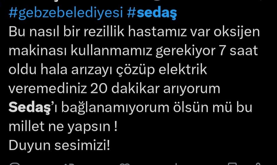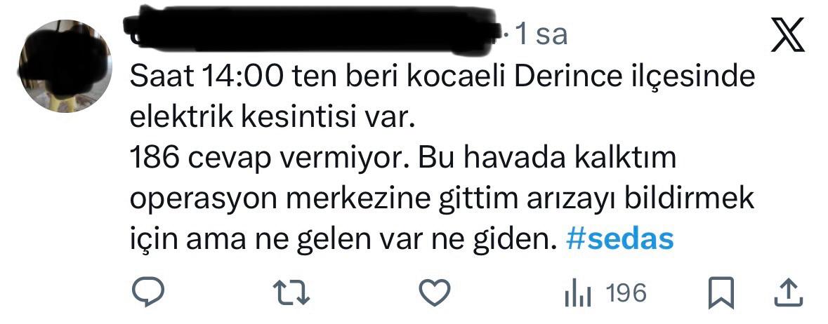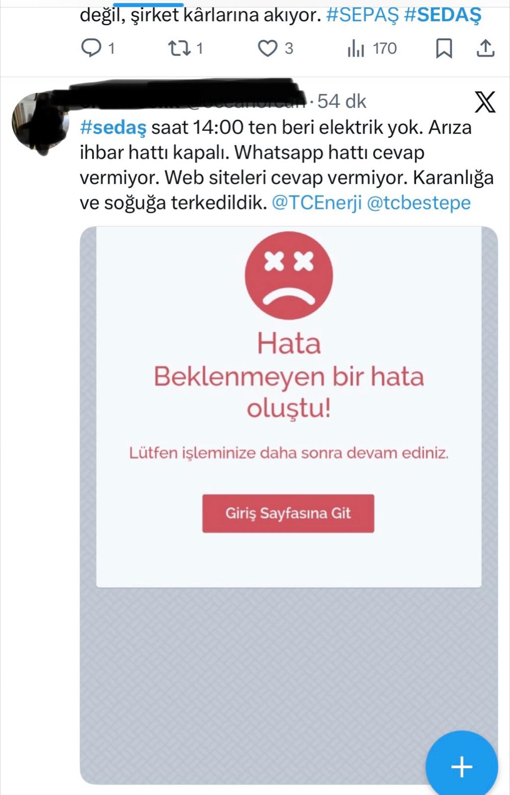 Elektrik kesintisinin uzun sürmesi nedeniyle mağduriyetler artıyor. Birçok mahallede hem çağrı merkezine hem de SEDAŞ’a ulaşamadıklarını belirten vatandaşlar, sosyal medya ve yakın çevreleriyle durumu paylaşmaya çalışıyor.