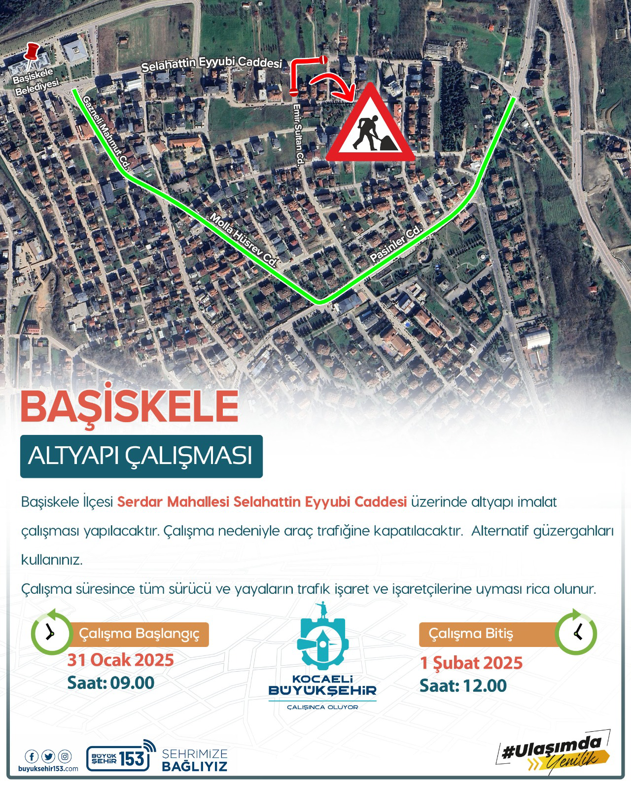Başiskele İlçesi Karadenizliler Mahallesi Ordulu ve Fakülte Caddeleri üzerinde yapılacak altyapı imalat çalışmasının 1 Şubat saat 09.00’da başlayıp 1 Şubat saat 19.00’da bitmesi planlanırken Serdar Mahallesi Selahattin Eyyubi Caddesi üzerinde yapılacak altyapı imalat çalışmasının ise 31 Ocak saat 09.00’da başlayıp 1 Şubat saat 12.00’da bitmesi planlanıyor.