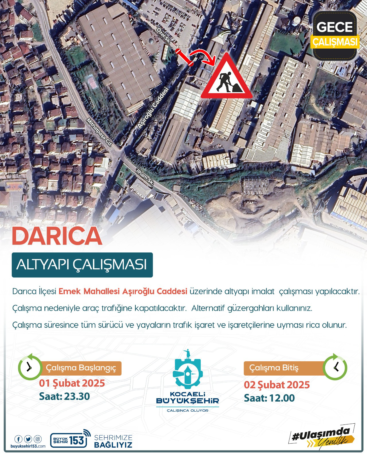 Darıca İlçesi Emek Mahallesi Aşıroğlu Caddesi üzerinde yapılacak altyapı imalat çalışmasının 1 Şubat saat 23.30’da başlayıp 2 Şubat saat 12.00’da bitmesi planlanıyor.