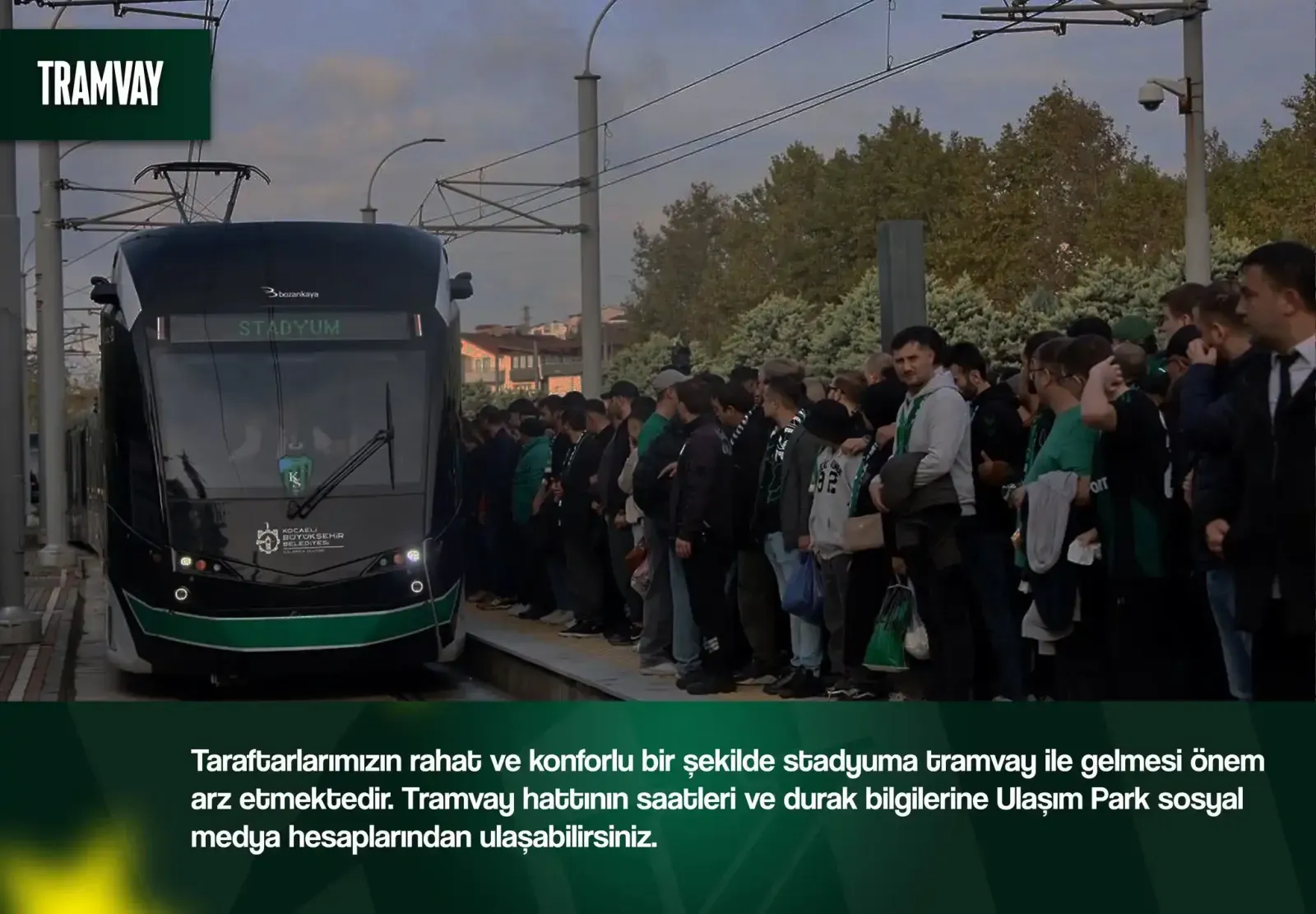 Temsilcimiz Kocaelispor, hem park sorunu yaşamamak hem de stadyuma en hızlı şekilde ulaşmak için taraftarlara öncelikli olarak tramvay kullanımını önerdi. Tramvay sefer saatleri ve durak detayları için taraftarların UlaşımPark sosyal medya hesaplarını takip etmeleri istendi.